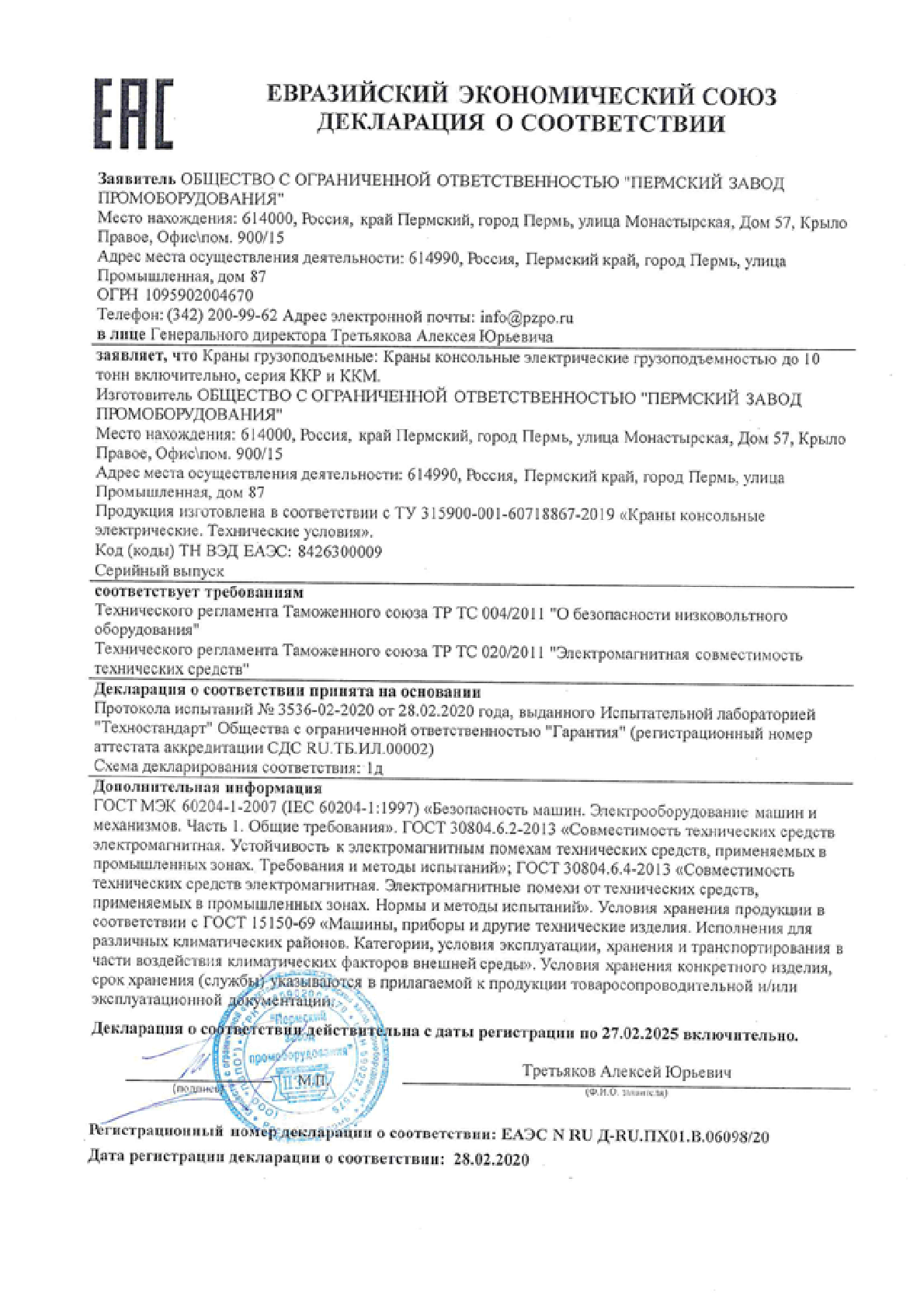 Сертификат ТР ТС Краны консольные электрические передвижные 10 тонн