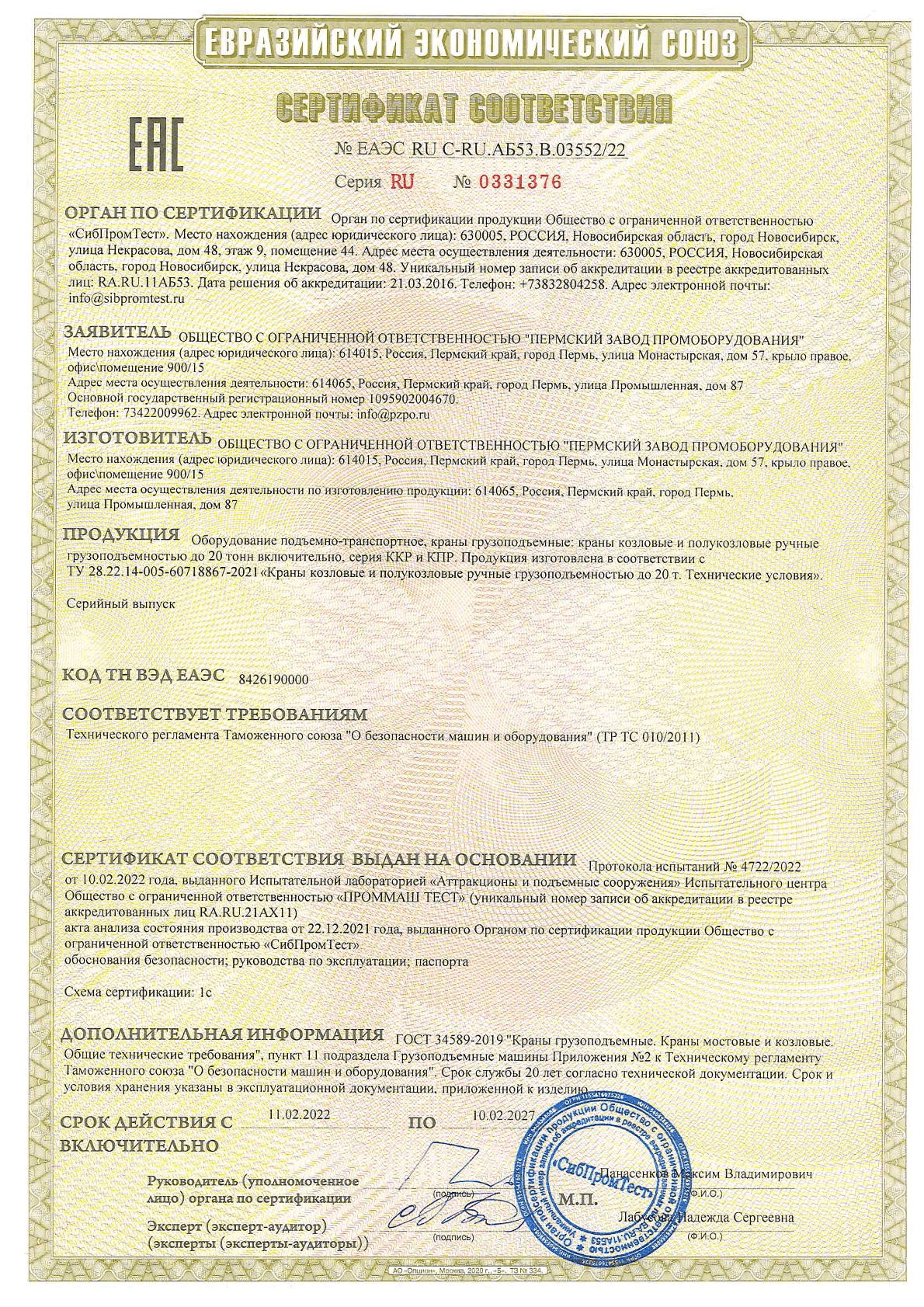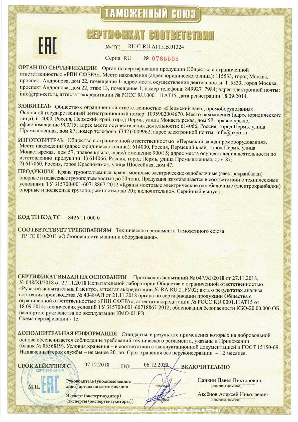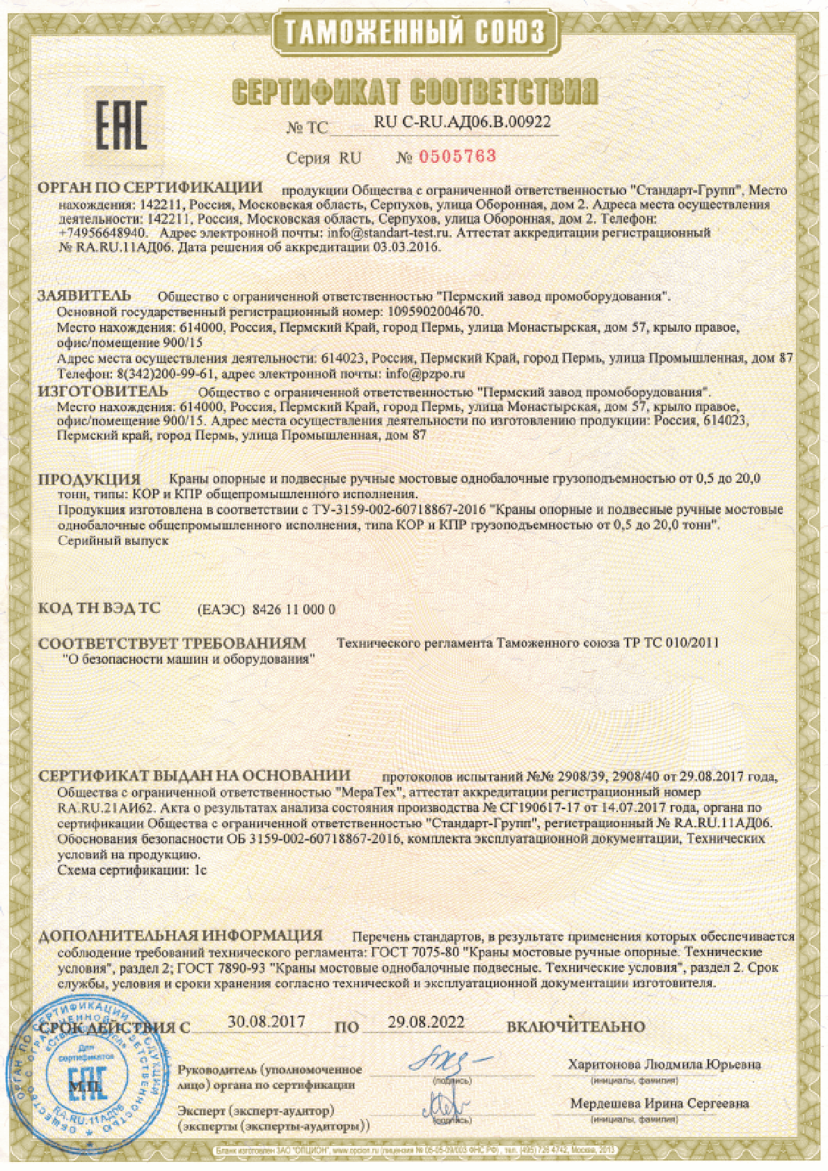 Сертификат ТР ТС - Козловые и полукозловые ручные до 20 тонн