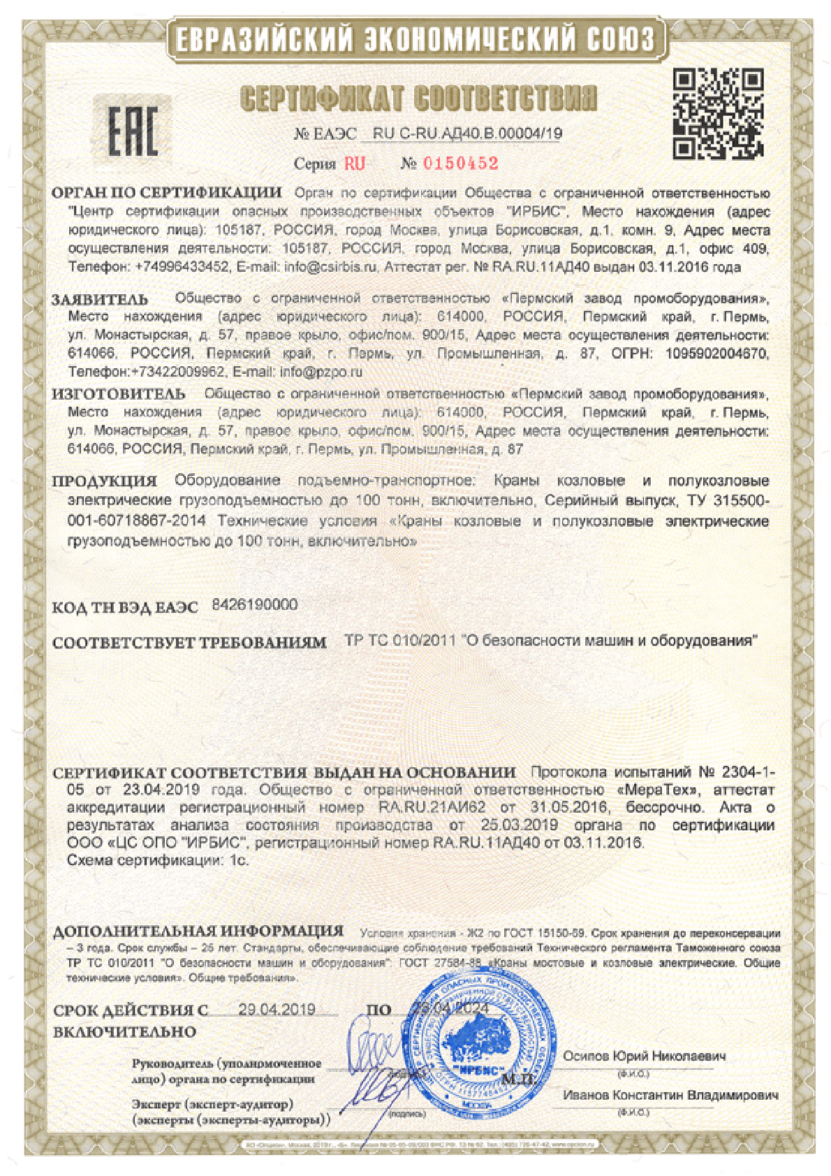 Сертификат сейсмичность 9 баллов козловые и полукозловые до 100т
